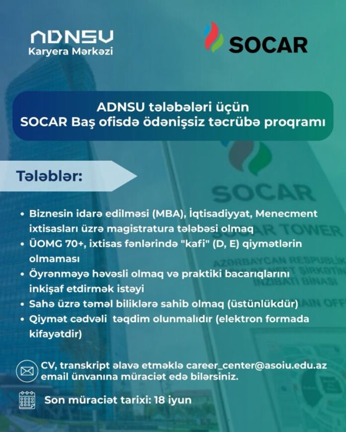 Azərbaycan Dövlət Neft və Sənaye Universitetinin (ADNSU) magistratura tələbələri üçün SOCAR Baş ofisində Səriştəliliklərin qiymətləndirilməsi və İR əməliyyatlarının koordinasiyası şöbəsində ödənişsiz təcrübə proqramında iştirak imkanı yaradılmışdır.
