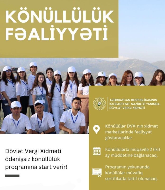 İqtisadiyyat Nazirliyi yanında Dövlət Vergi Xidmətinin vergi ödəyicilərinə xidmət mərkəzlərində təcrübə qazanmaq, vergi biliklərini artırmaq və əldə olunan təcrübəni təsdiqləyən sertifikat əldə etmək üçün könüllü fəaliyyətə qeydiyyat aparılır.