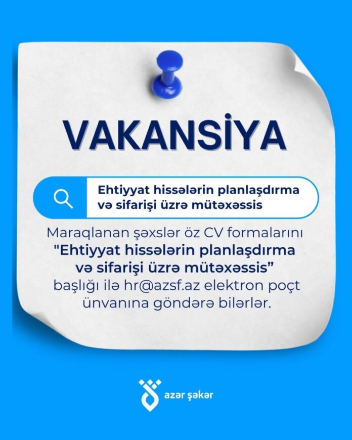 Maraqlanan şəxslər öz CV formalarını “Ehtiyyat hissələrin planlaşdırma və sifarişi üzrə mütəxəssis” başlığı ilə hr@azsf.az elektron poçt ünvanına göndərə bilərlər.