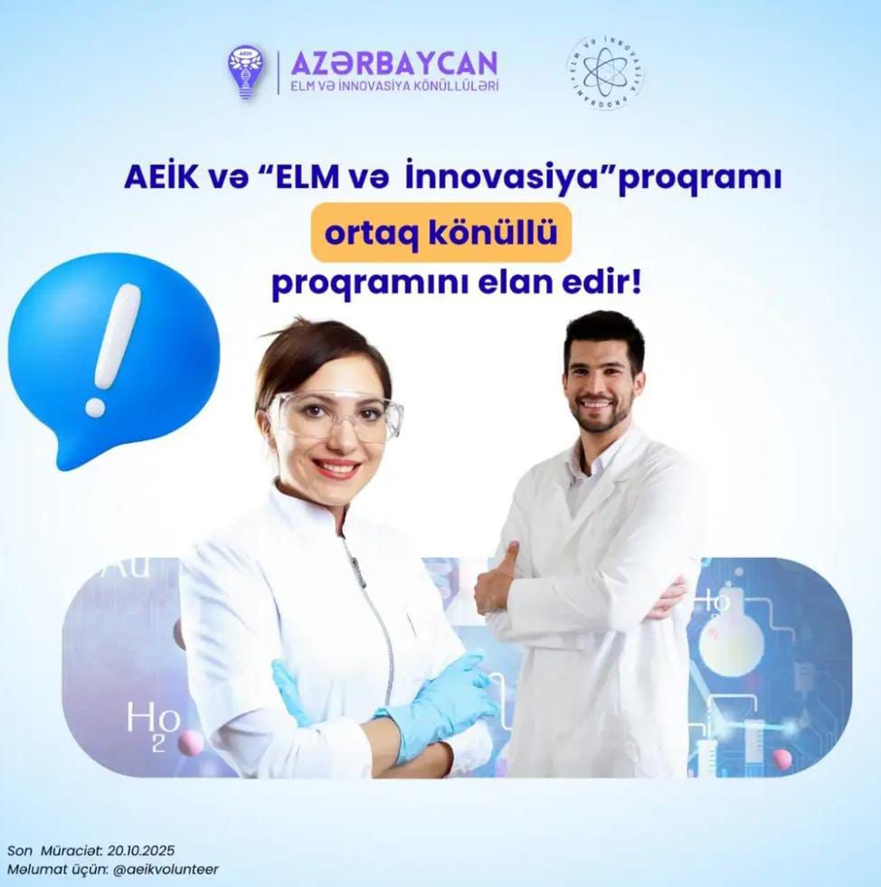 Azərbaycan Elm və İnnovasiya Könüllüləri (AEİK) və “Bir Könüllü” Tələbələrin Əməkdaşlığı İctimai Birliyi sizi “Elm və İnnovasiya” Könüllülük Proqramına qoşulmağa dəvət edir!