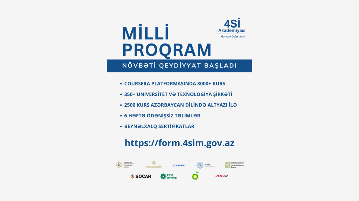 İqtisadiyyat Nazirliyinin tabeliyində Dördüncü Sənaye İnqilabının Təhlili və Koordinasiya Mərkəzi (4SİM) və Təhsilin İnkişafı Fondu arasında əməkdaşlıq nəticəsində “4Sİ Akademiyası” çərçivəsində “Milli Proqram” istifadəçilərinin “Coursera” platformasında əldə edə biləcəyi kursların sayı artırılıb.