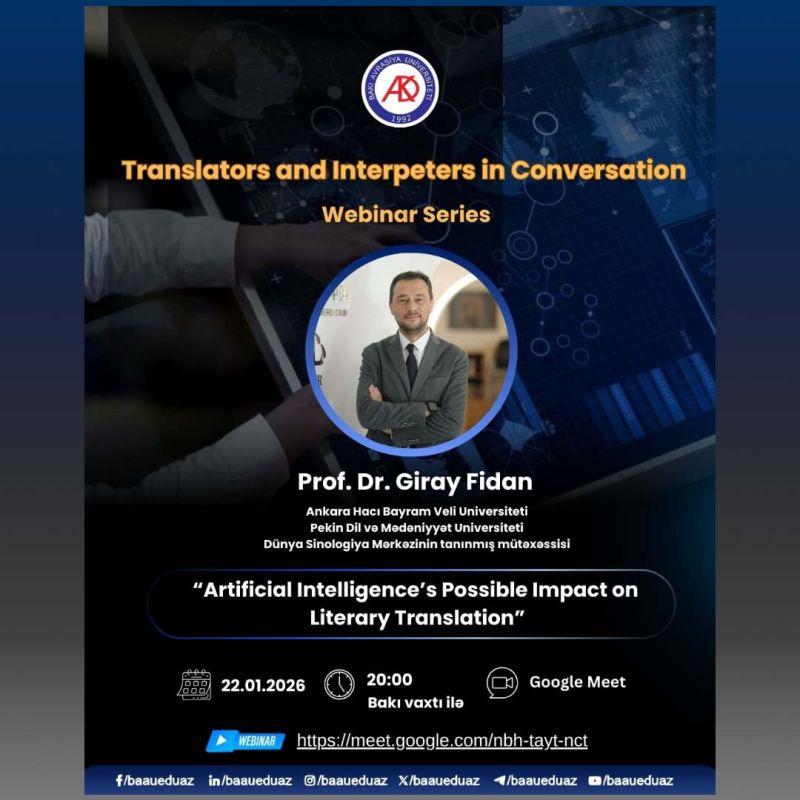 ELAN: Bakı Avrasiya Universitetinin (BAAU) Filologiya fakültəsinin Tərcümə kafedrasının təşkilatçılığı ilə “Süni intellektin bədii tərcüməyə mümkün təsirləri” mövzusunda vebinar keçiriləcək.
